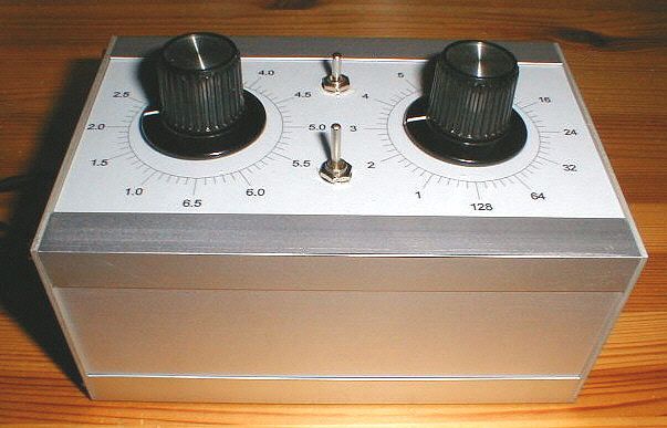 Bauvorschlag eines fertigen E-Meter-Prüfgerätes. Die Skala wurde zum Schutz gegen Verschmutzung mit einer Klarsichtfolie überklebt. Die Verbindung zum E-Meter erfolgt mittels zweiadrigem Kabel und einem 6.3mm Klinkenstecker. Die Taster wurden hier als Schalter ausgeführt, um in Ruhe Messungen mit beiden Händen durchführen zu können.